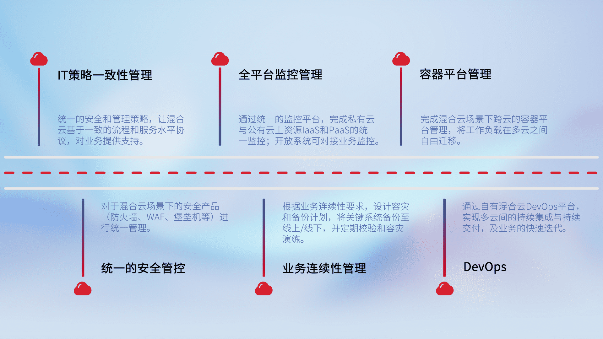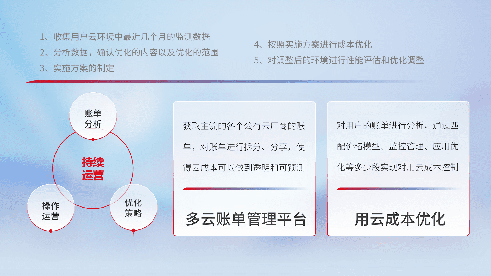 通过多云纳管,,以统一的资源数据模型把客户的云资源进行抽象和封装,,进而实现对多云资源的统一操作,,,,保障云资源管理的可靠性、、、、稳定性与可用性。。量身定制化运维内容,,,,配置、、、、开发运维、、、、补丁管理、、备份、、、、监控、、、认证和访问管理、、、、审计和日常巡检等,,,,保障在用云过程中的可靠度,,,,稳定度以及高可用率。。。