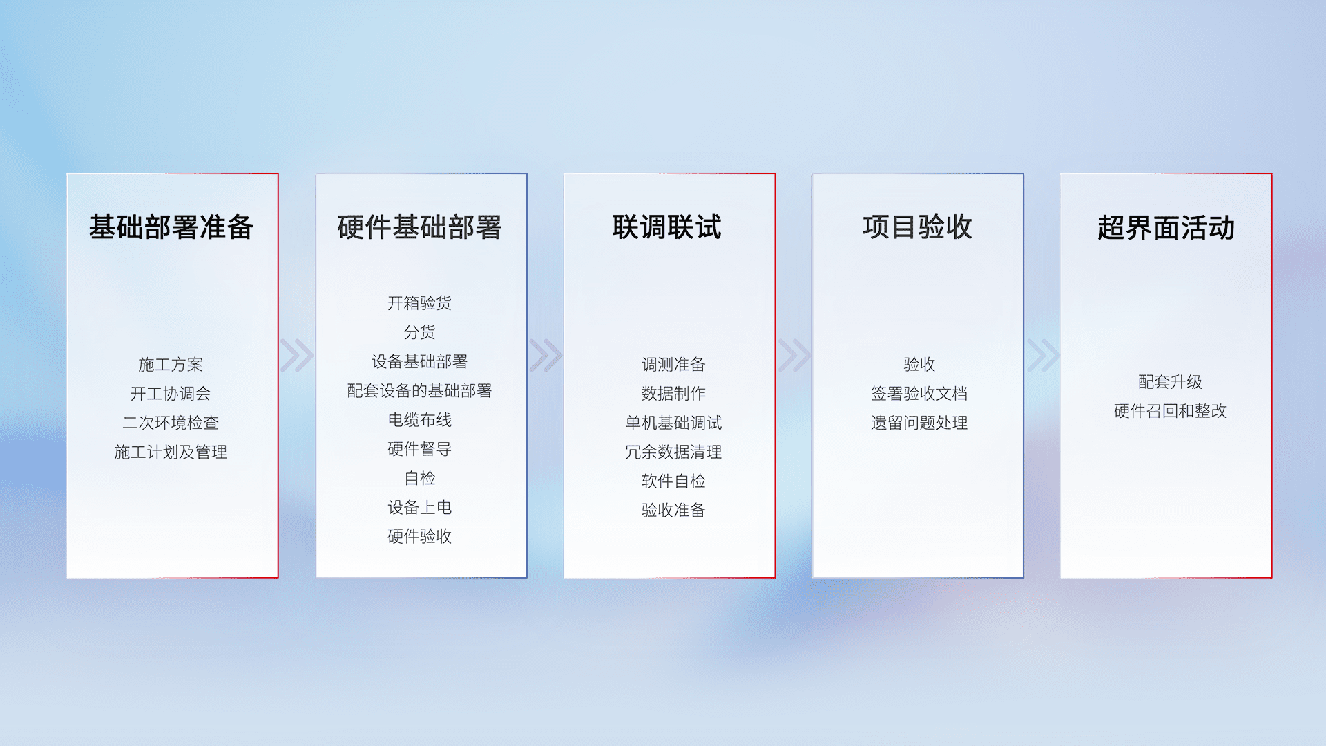从基础部署准备、、、、硬件基础部署、、、、联调联试、、、、项目验收、、、越界面活动的全过程可追溯,,,保证施工质量和进度。。。